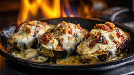 Closeup on grilled eggplant with shrimp and cheese