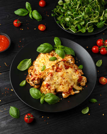 Baked Cauliflower steak with marinara sauce and cheese on plate. Healthy vegetarian food