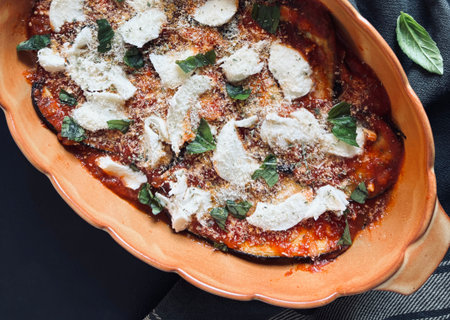 eggplant parmigiana, aubergine baked in a dish with tomato sauce, basil, parmesan and mozzarella cheese, italian cuisine, flat lay, close-up