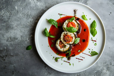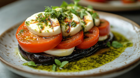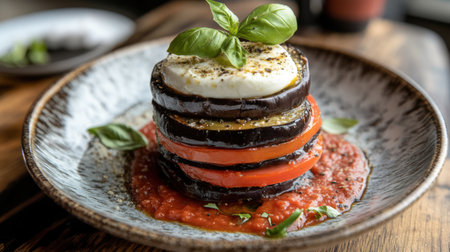 A beautifully plated stack of fresh eggplant and tomato slices, topped with mozzarella and basil, served on a vibrant sauce. Perfect for food photography.
