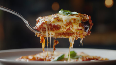 A tempting forkful of melanzane alla parmigiana, showcasing rich layers of cheese, savory sauce, and fresh basil. Ideal for food lovers and culinary enthusiasts.