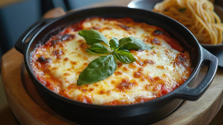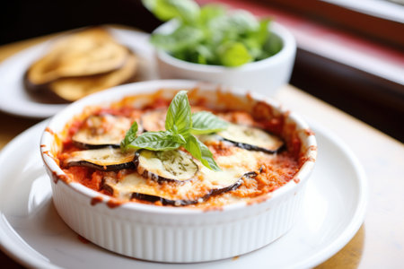 Enjoy a delicious serving of classic melanzane alla parmigiana, featuring layers of eggplant, tomato sauce, and cheese, garnished with fresh basil leaves.