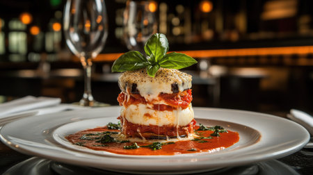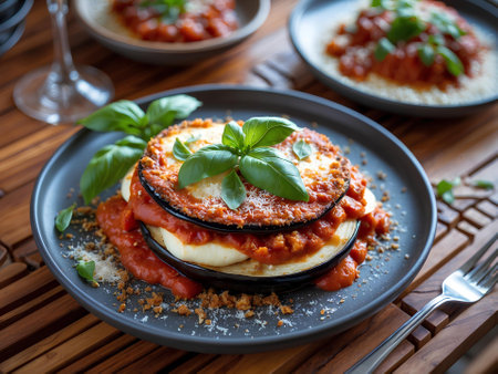 Discover a beautifully plated Melanzane alla Parmigiana, showcasing layers of eggplant, cheese, and fresh basil. Perfect for any gourmet occasion.