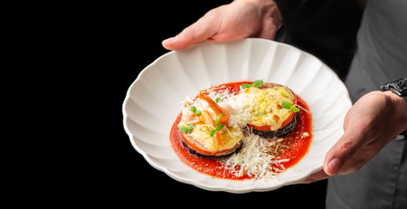 Chef holding a plate of baked eggplant with tomatoes, shrimp, parmesan, and tomato sauce. copy space, top view.