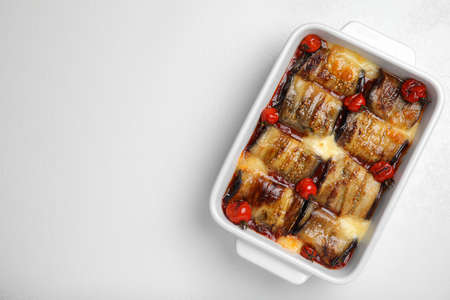 Tasty eggplant rolls with tomatoes and cheese in baking dish on white table, top view. Space for text
