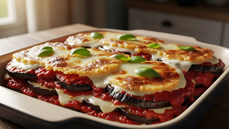 A freshly baked casserole of Eggplant Parmesan features layers of sliced eggplant, rich tomato sauce, and melted mozzarella cheese. The dish is presented in a ceramic baking pan, garnished with fresh basil leaves, ready to be served.