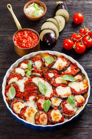 eggplant parmigiana, aubergine baked in a dish with tomato sauce, basil, parmesan and mozzarella cheese, italian cuisine, vertical view