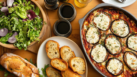 A beautiful serving of melanzane alla parmigiana, surrounded by fresh salad and rustic bread. Perfect for an Italian dining experience full of flavor.