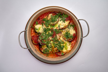 Roll with eggplant and ricotta in tomato juice with parmesan. Baked eggplant with sauce and basil. View from above.