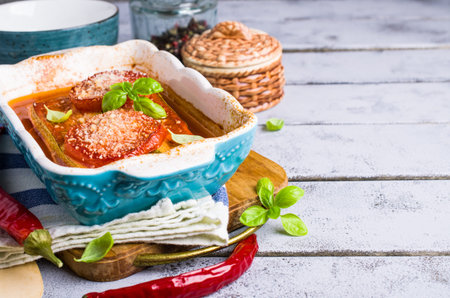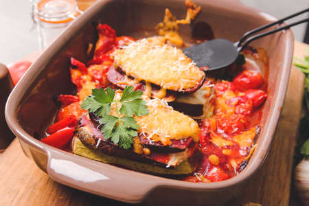 Baked slices of vegetables with cheese in a baking dish on a wooden table. Selective focus.