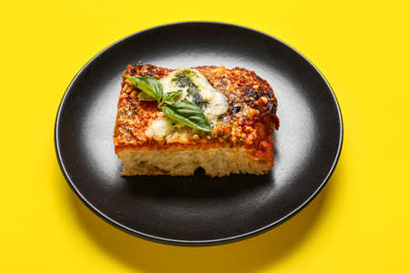 Plate with piece of tasty Italian pie on yellow background