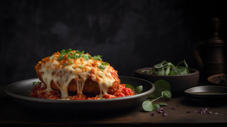 AI Generated. Deliciously mouthwatering Eggplant parmigiana layers of eggplant cheese tomato sauce basil baked casserole