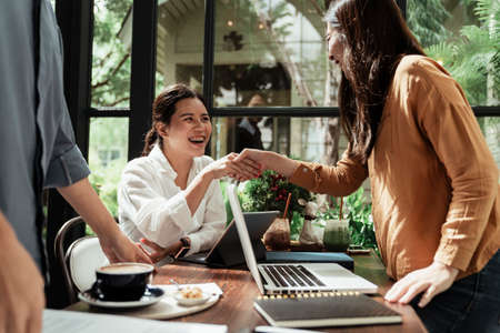Business women partner people joining hand after contract and present finance graph finished meeting. Teamwork Concept.
