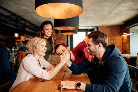 Young attractive women girl friends and their new male friends playing, wrestling and smiling while spending time together at trendy pub. Fun, holiday, youth and togetherness Concept .