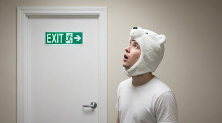 A person in a whimsical polar bear hat stands with a look of surprise, gazing up at a green emergency exit sign on a plain white door in a corridor.
