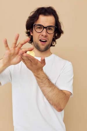Young man is happy about a large income from the Internet, Wealth or prosperity concept