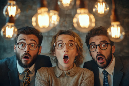 Group of three adults displaying shock and surprise as they react to an unexpected moment in a stylishly decorated indoor setting filled with warm, glowing lights.