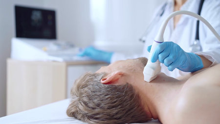 Doctor woman with a blue medic gloves performing neck ultrasound exam on male patient. Medicine service concept. Thyroid gland health