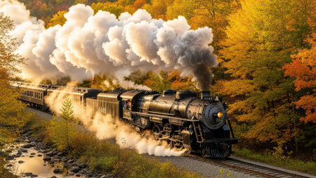 A majestic vintage steam train chugs through a vibrant autumn landscape, its journey illuminated by the golden hues of sunset.