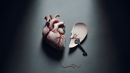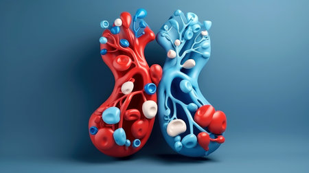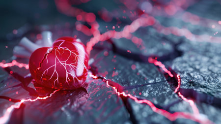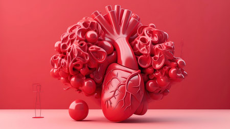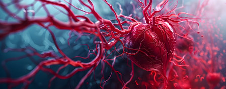 Detailed artistic illustration of a heart with blue veins on a red background, symbolizing interconnectedness and complexity. AI generative