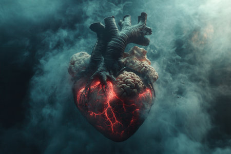 Burning anatomically correct human heart with brain and roots growing out of it
