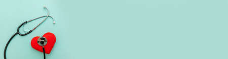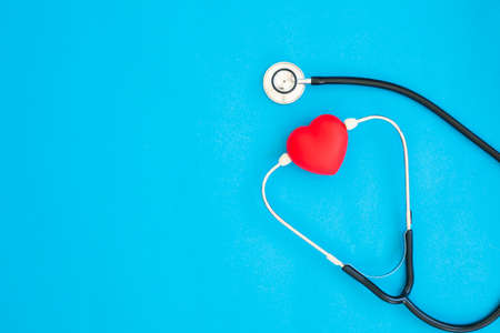 Simply minimal design with medicine equipment stethoscope or phonendoscope and red heart isolated on pastel blue background. Instrument device for doctor. Health care life insurance concept banner