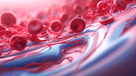 Detailed perspective of blood vessels filled with bright red cells on a twisted, dark background. The intricate network highlights the beauty of biological structures.