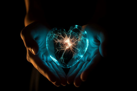 Glowing human heart hands glowing. Giving support care health celestial. Generate Ai