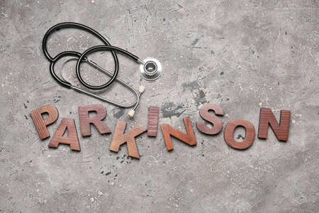 Word PARKINSON with stethoscope on grunge background