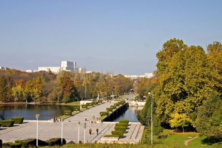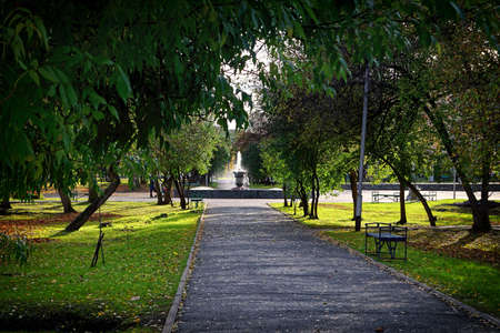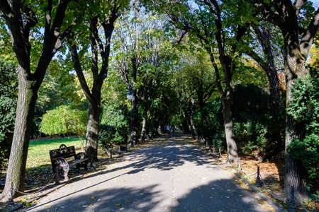 Landscape with the main alley with vivid green and yellow plants, green lime trees and grass in a sunny autumn day in Cismigiu Garden in Bucharest, Romania