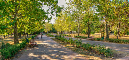 Chernomorsk, Ukraine 08.22.2020. Seaside Yuonost park and boulevard in Chernomorsk city on a sunny summer morning