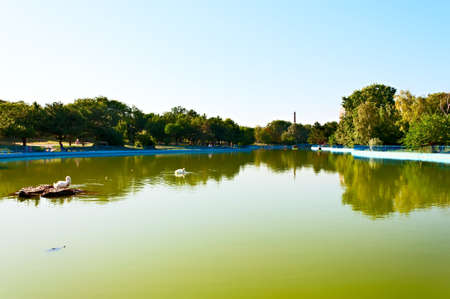 Bucharest, ROMANIA - August 14 2016: Peaceful corner of IOR park with swans on an emerald green lake. BUCHAREST -August 14 2016