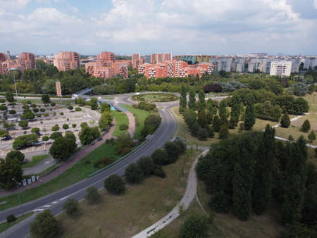 Wroclaw July 5 2019 Aerial look to park with blocks of flats and buildings around
