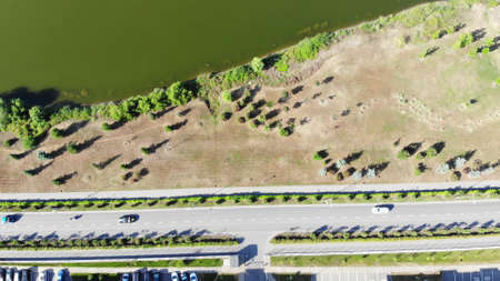 Road with a cars driving along the autumn grass and green lake. Clip. Aerial view of a big pond with green water and small town under the bright early autumn sun.