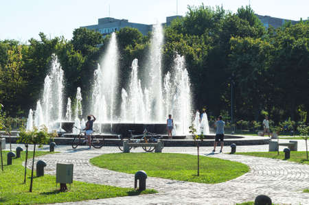 Bucharest, ROMANIA - August 21 2016: People relaxing near the fountain in Alexandru Ioan Cuza park or IOR park on a Sunday afternoon. BUCHAREST -August 21 2016