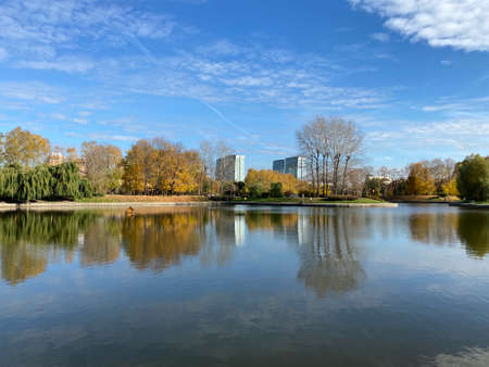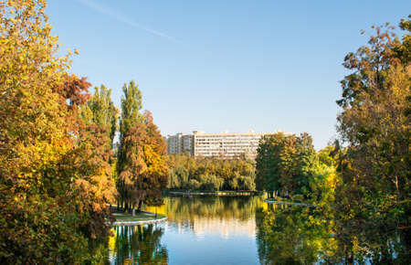 View of a large lake surrounded by beautiful colored trees in the middle of a park in the city, on a beautiful autumn evening.
