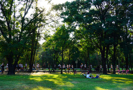People are jogging and cycling in the public park in the early morning at Wachirabenchathat Park or State Railway Public Park is a name of public park in Chatuchak district, Bangkok, Thailand.