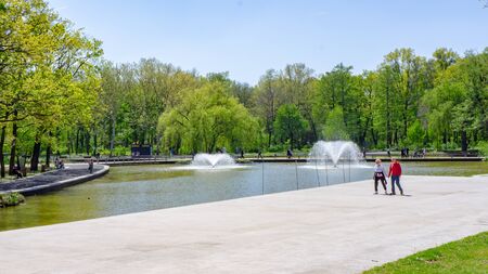Bucharest, Romania - 16 May 2020: People in Cismigiu Park on the second day of relaxation of the measures taken by the authorities against the COVID-19 pandemic, in Bucharest.