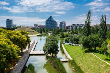 Bucharest, Romania - 29 May 2021: Landscape with lake and vivid green trees in Drumul Taberei Park (Parcul Drumul Taberei) also known as Moghioros Park, in Bucharest, Romania, in a cloudy summer day