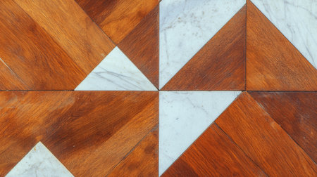 showing detailed close-up of a geometric wood mosaic pattern featuring interlocking triangles and parallelograms in various natural wood grain textures and...