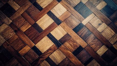 Detailed view of a richly textured wooden floor resembling parquet flooring, composed of intricately arranged planks, evoking warmth and sophistication in a luxurious atmosphere.