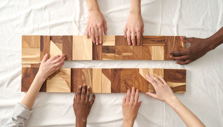 From a top-down perspective, a diverse group of hands comes together to assemble a puzzle of wooden blocks.