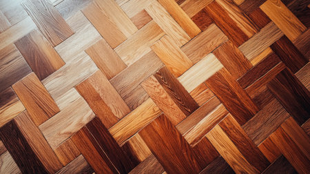 Top view of a parquet wooden floor with intricate geometric patterns, offering a timeless and stylish background