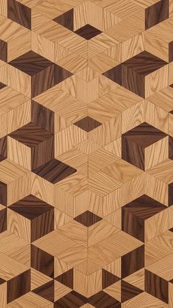 Patterned wooden floor background with interlocking dark and light wood tiles, creating a geometric design.