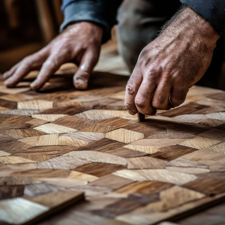 Close up shot showing a man's skilled hands meticulously assembling a complex geometric pattern with small pieces of wood. Warm, natural light illuminates the scene highlighting the craftsmanship and attention to detail.