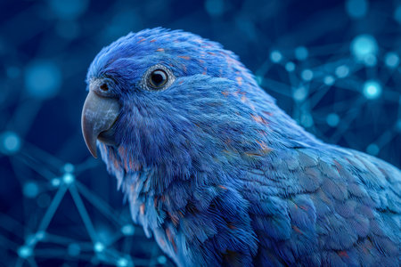 A striking blue bird with intricate feathers perches against a backdrop of glowing circuits, blending nature's beauty with modern technology.