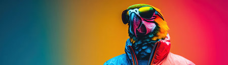 Parrot in neon windbreaker, vibrant colors, studio setup