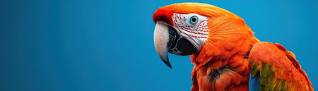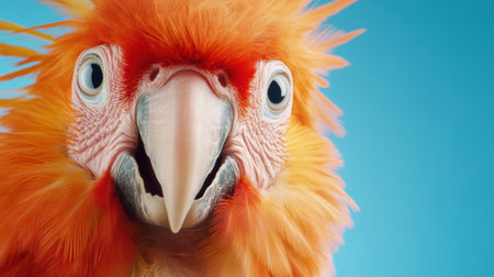 Closeup of a bright red parrot against a solid blue background, sharp details
