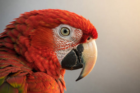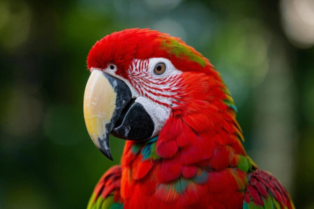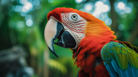 This close-up image showcases a vibrant red macaw parrot, beautifully perched among lush tropical foliage. Soft light highlights its colorful feathers and captivating expression.