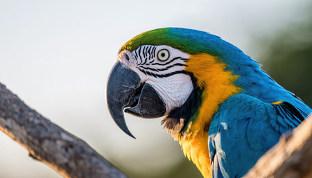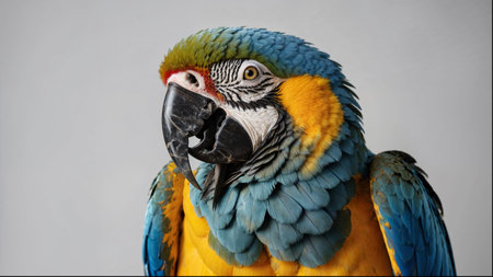 A detailed close-up shot of a Blue and Gold Macaw parrot, showcasing its colorful plumage and intelligent eyes.